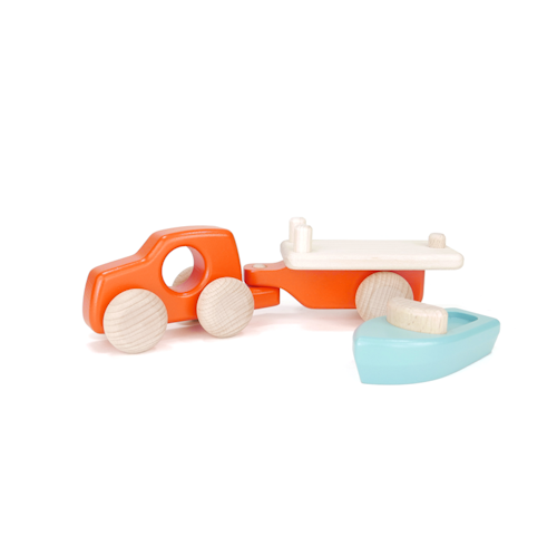 Das blaue Auto Holzauto bringt das Boot zum nächsten Gewässer. Tolles Holzspielzeug ab 18 Monaten