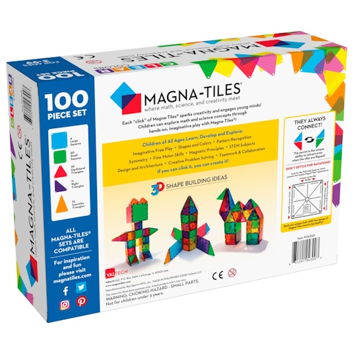 Das Set enthält eine Mischung aus Quadraten und Dreiecken, so dass Kinder alles erschaffen können, was sie sich erträumen. Das 100-teilige Magna-Tiles® Classic Set fördert nicht nur das Lernen, sondern gewährleistet dank der robusten Konstruktion der einzelnen Teile auch die Sicherheit der Kinder. Die magnetischen Blöcke bestehen aus widerstandsfähigem Kunststoff, starken Keramikmagneten und sind mit Nieten befestigt, so dass sie über Jahre hinweg halten. Abgesehen von der Langlebigkeit stammen die lebendigen, klaren Farben jeder transparenten Form von hochwertigen, ungiftigen Farbstoffen und einer Oberfläche, die resistent gegen Kratzer und Dellen ist.