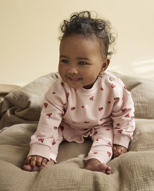 Bambusviskose-Baumwolle Sweatpants von Minymo. Mit einem breiten Elastikbund und süssem Mariekäfer-Print.