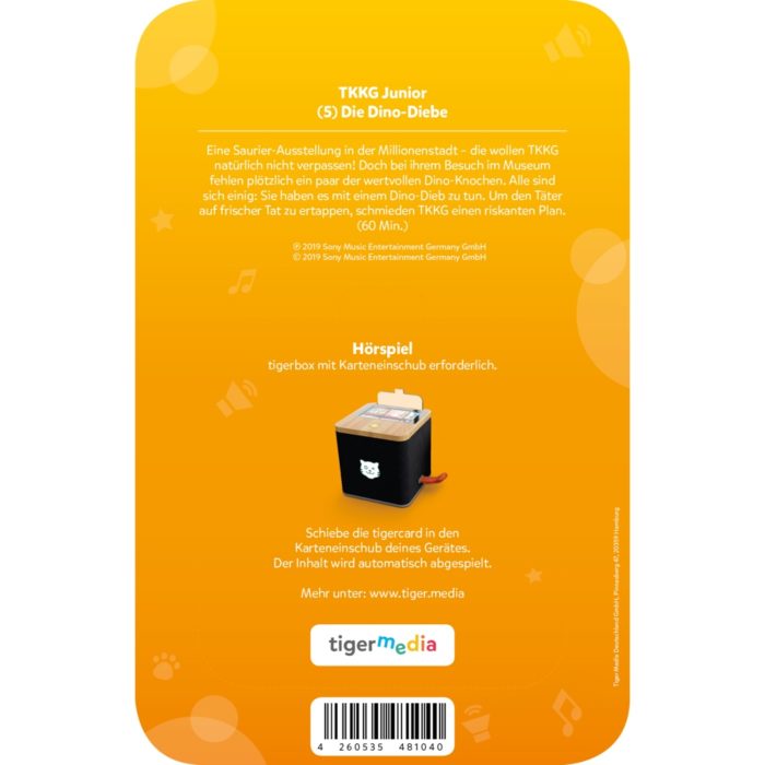 Eine Saurier-Ausstellung in der Millionenstadt – die wollen TKKG natürlich nicht verpassen! Doch bei ihrem Besuch im Museum fehlen plötzlich ein paar der wertvollen Dino-Knochen. Alle sind sich einig: Sie haben es mit einem Dino-Dieb zu tun. Um den Täter auf frischer Tat zu ertappen, schmieden TKKG einen riskanten Plan. Titel: TKKG Junior (5): Dino-Diebe EAN: 4260535481040 UVP: CHF 11,90 Empfohlen ab 5 Jahren Laufzeit: 60 Min. EUROPA tigercards: Alle Lieblingsgeschichten zum Anfassen – Viel Hörspass zum fairen Preis – Innovative Bedienung für Gross und Klein – Kratzfest, robust und störungssicher – Auch offline nutzbar